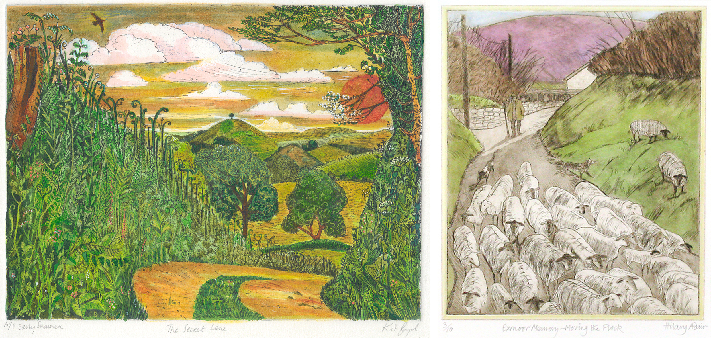 Hand coloured etching by Kit Boyd, etching with Aquatint by Hilary Adair