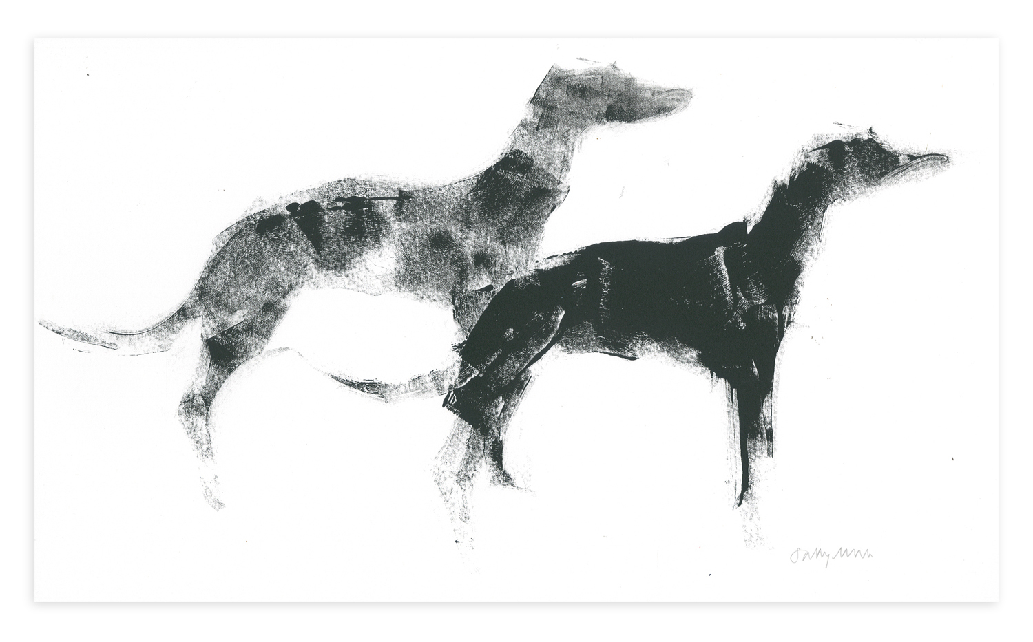In drypoint, the artist scratches the image directly into a metal plate, without the use of acid. The ink collects in the scratched lines and the raised edges (called “burrs”), creating softer lines than etchings. However, because the burrs wear away with repeated prints, drypoint is typically suited for smaller editions.
