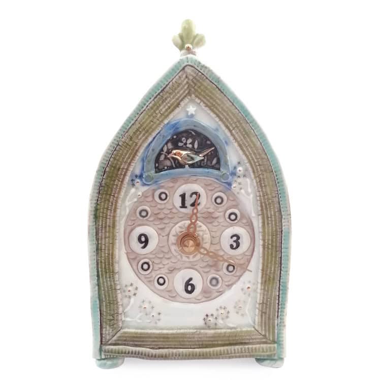 Hand made porcelain with hand mixed glazes and gold lustre with battery operated clock movement