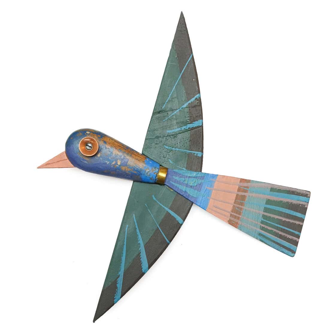 Painted driftwood and mixed media sculpture (Includes fixture for wall hanging)